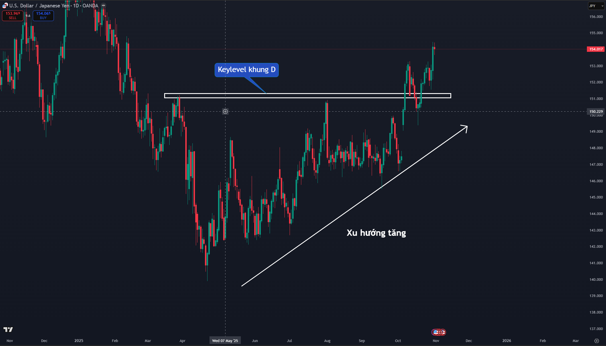 - Khung D1: Thị trường USDJPY xu hướng chính đang tăng