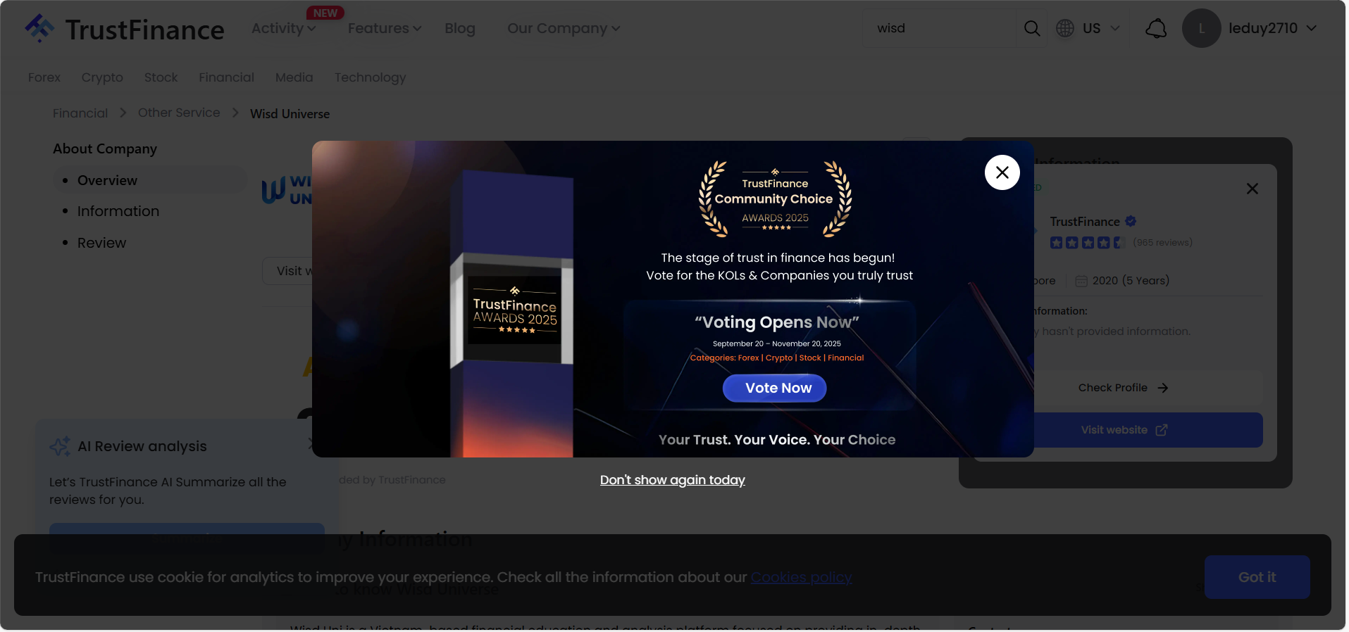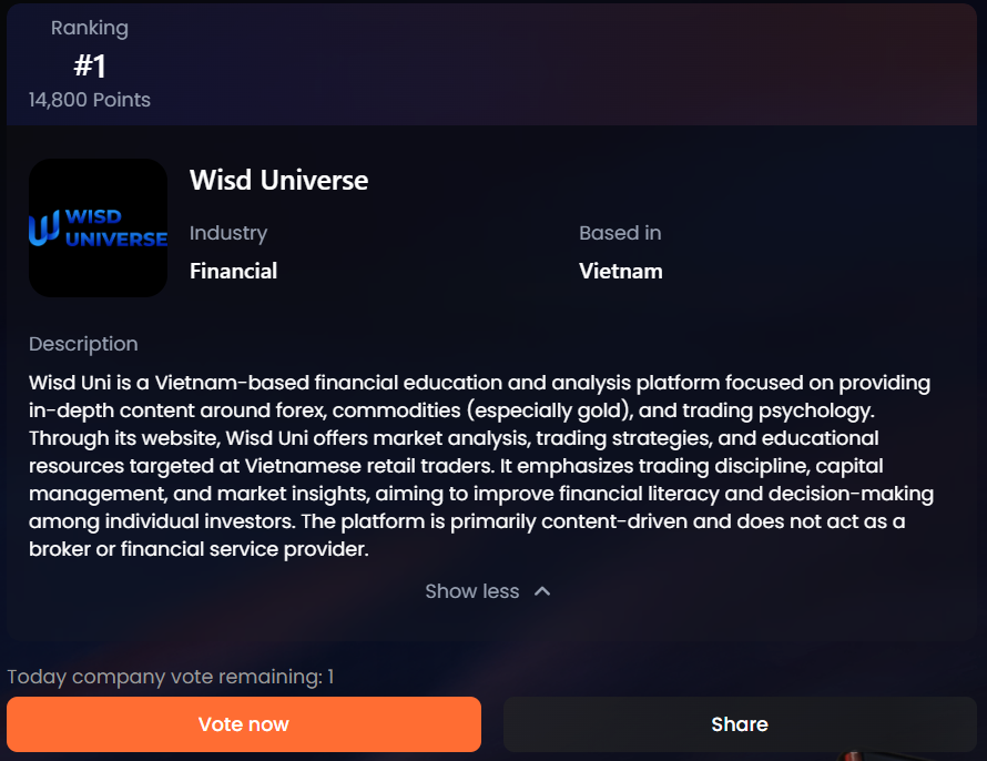Trong bối cảnh đó, Wisd Universe – nền tảng giáo dục tài chính từ Việt Nam – xuất hiện như một “gương mặt mới” giàu tiềm năng tham gia sân chơi quốc tế này. Wisd Universe đã được liệt kê trên TrustFinance với hồ sơ công ty và thông tin rõ ràng về sứ mệnh hỗ trợ nhà đầu tư cá nhân tại Việt Nam qua phân tích thị trường, chiến lược giao dịch và giáo dục tài chính. Việc Wisd Universe tham dự TrustFinance AWARDS 2025 không chỉ là cơ hội tỏa sáng quốc tế mà còn là dấu mốc quan trọng cho việc mở rộng ảnh hưởng của nền tảng này ra khu vực và toàn cầu.